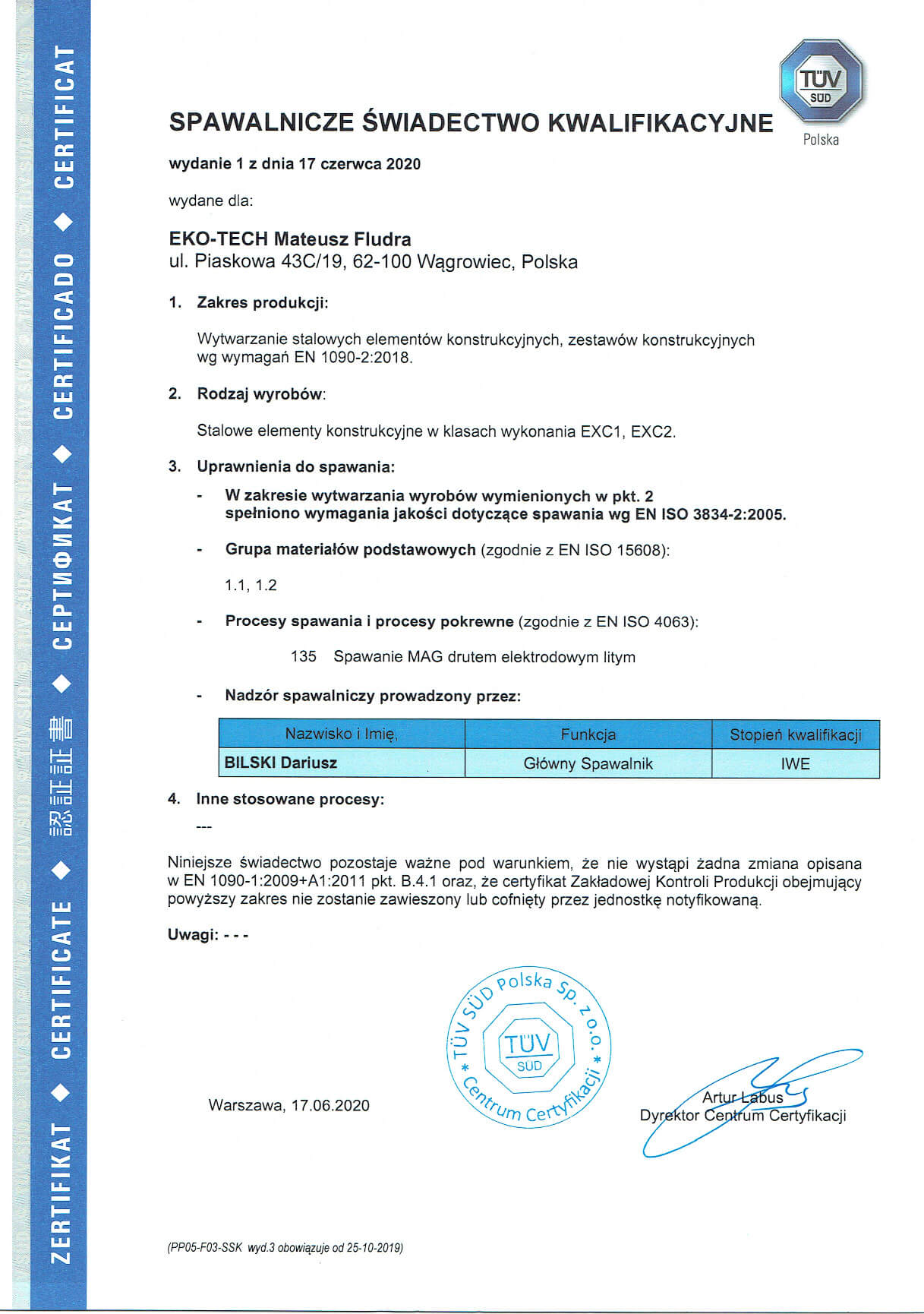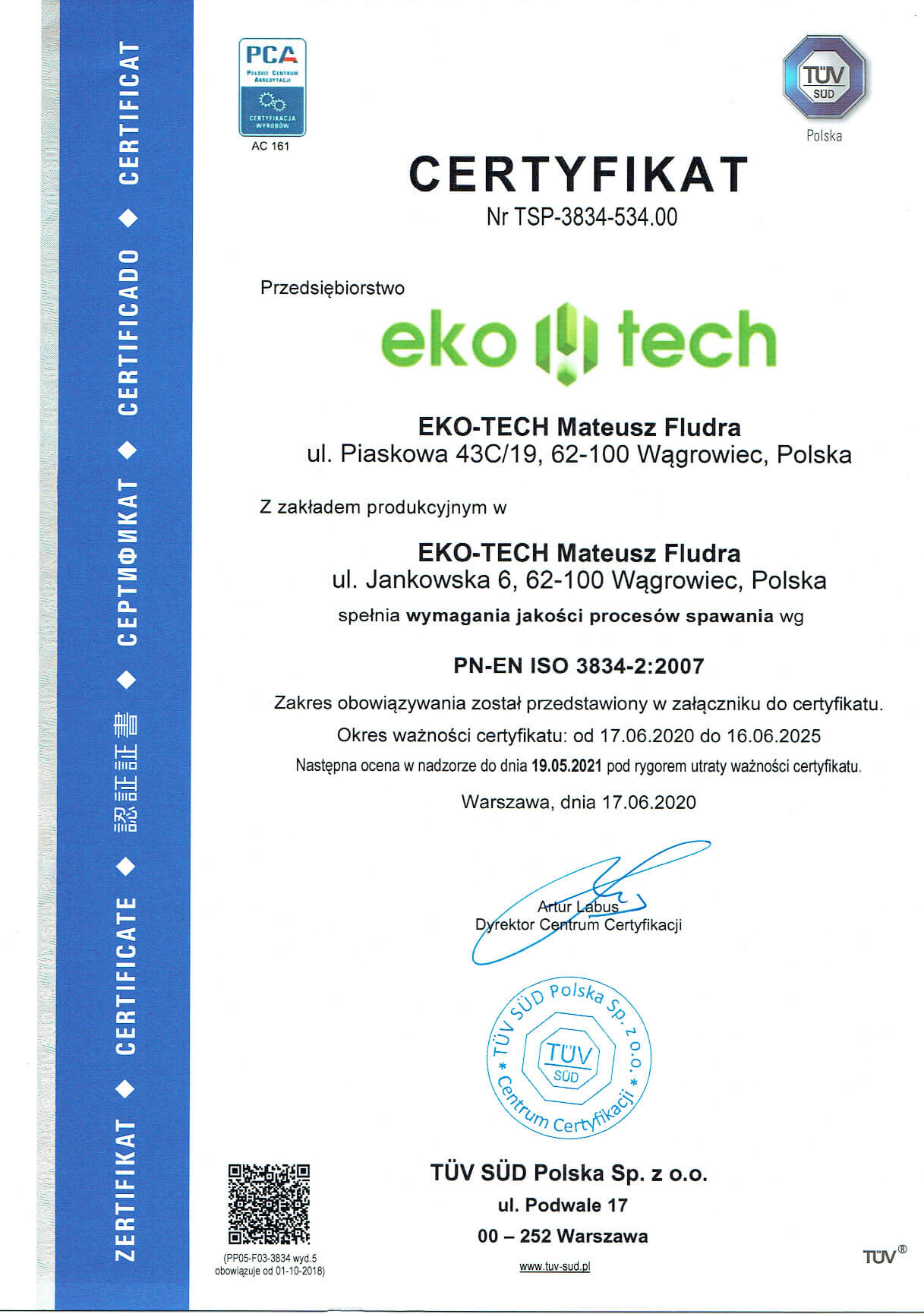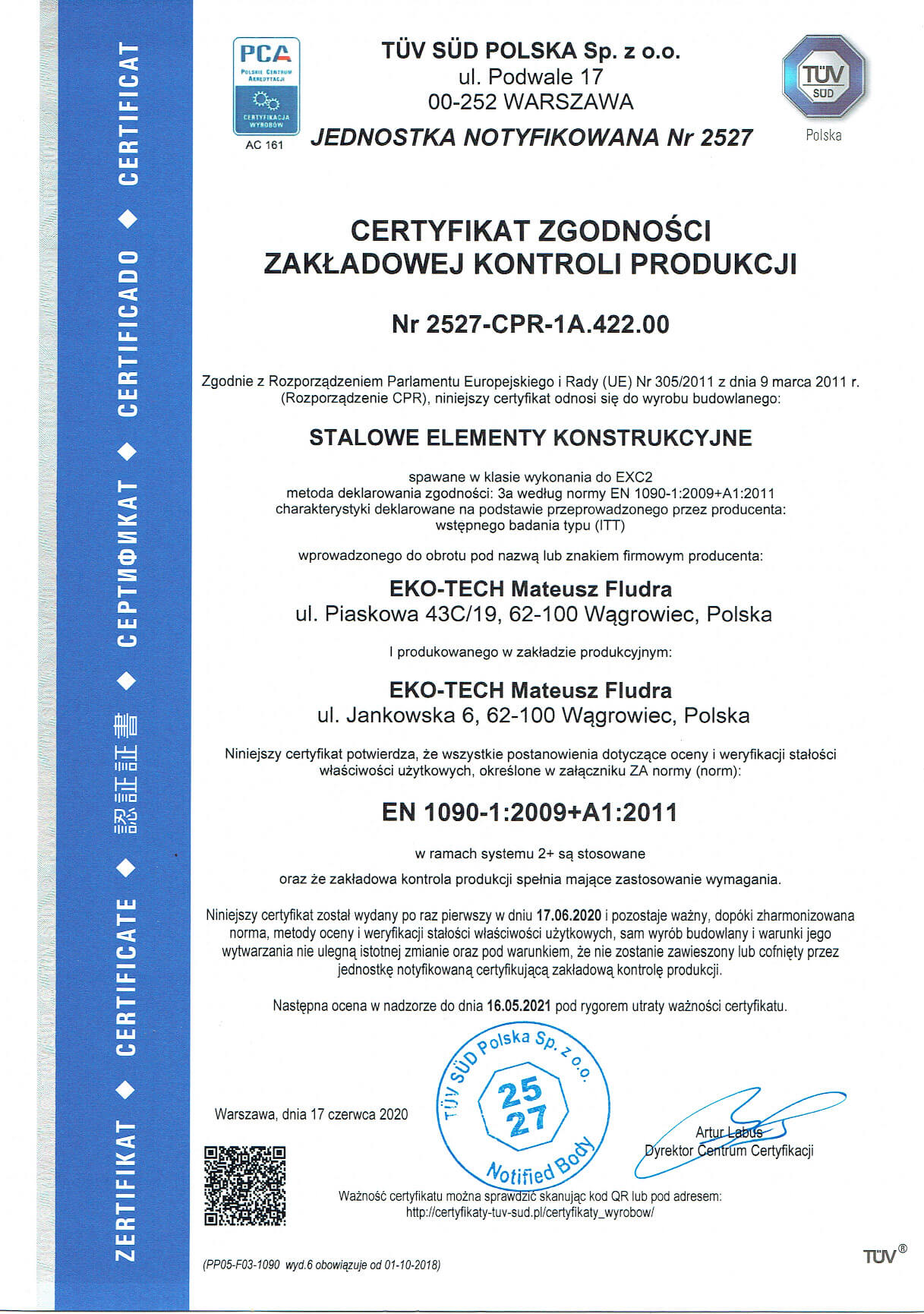 Dowodem dostarczania przez nas wyrobów na najwyższym poziomie są zdobyte przez firmę Eko-Tech Mateusz Fludra certyfikaty: